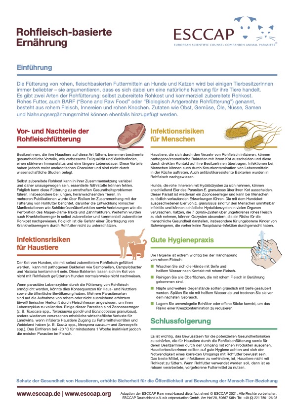 Mehr...ESCCAP-Servicematerial: Neues Factsheet zur Rohfleisch-basierten Ernährung von Hunden und Katzen Der Trend, Hunde und Katzen mit rohen, fleischbasierten Futtermitteln zu ernähren, beruht auf der Absicht, den Tieren eine …