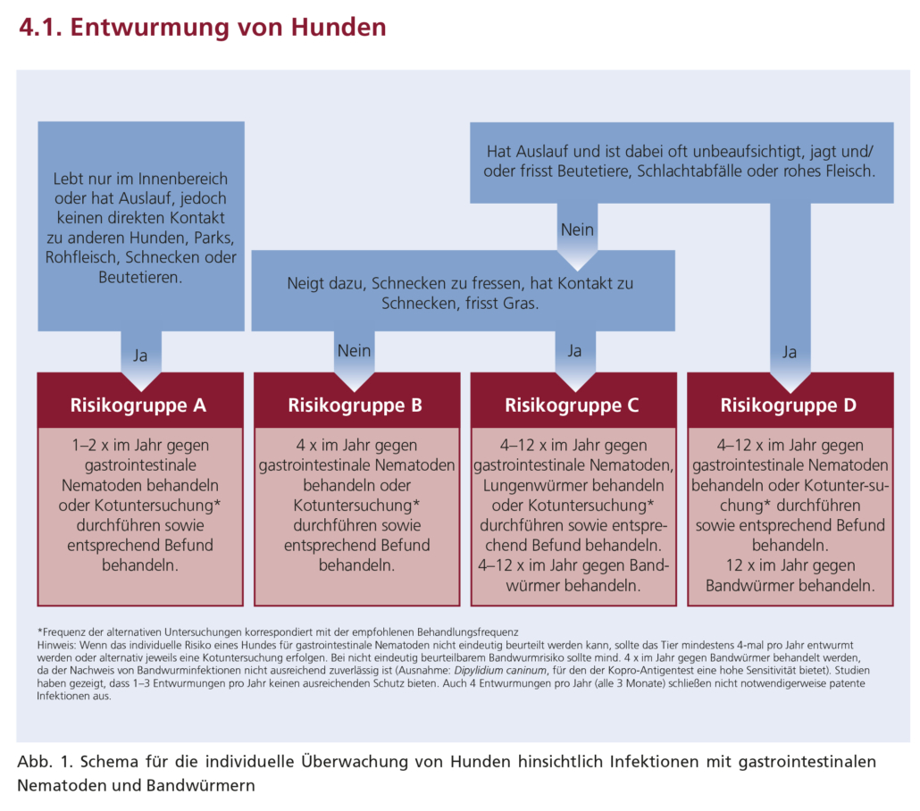 Die routinemäßige Behandlung und Vorbeugung von Wurminfektionen hängen von der jeweils geltenden Gesetzgebung, von den örtlichen und internationalen epidemiologischen Gegebenheiten und von individuellen Risikobewertungen, z. B. jagende Haustiere, frühere Lungenwurmexposition, Rohfleischernährung usw., ab. Das zoonotische Potenzial sowie seine Konsequenzen müssen ebenfalls berücksichtigt werden. Die Entwurmung sollte daher immer von einer Tierärztin/einem Tierarzt angeraten werden. Siehe Abbildungen 1 und 2: Schemata für die individuelle Entwurmung von Hunden und Katzen.