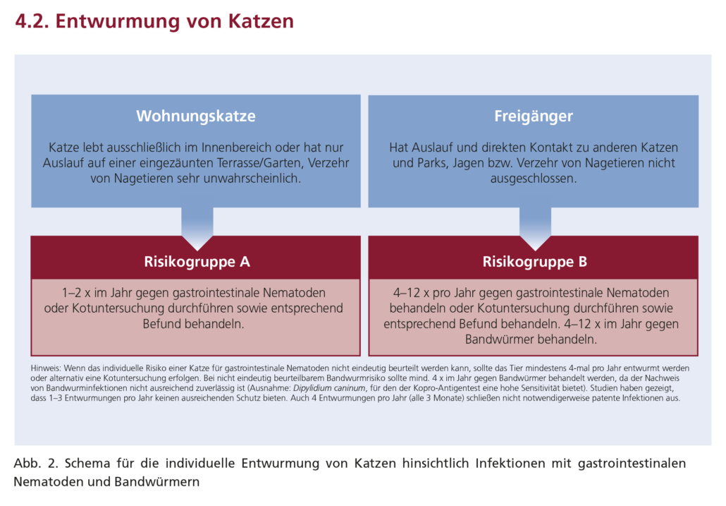 Allerdings wurden in jüngeren französischen Untersuchungen in Katzenkot zwar sehr selten, allerdings teilweise erhebliche Zahlen von möglicherweise infektiösen Eiern ermittelt. Aufgrund des gegenwärtigen Wissensstands ist somit ein Zoonoserisiko nicht ausgeschlossen, und es bleibt daher im Ermessen der verantwortlichen TierärztInnen sowie der TierhalterInnen, ob angesichts der individuellen Situation (z. B. Kleinkinder im Haushalt, sehr enger Kontakt zur Katze) dennoch in 4-wöchigen Intervallen behandelt werden soll.